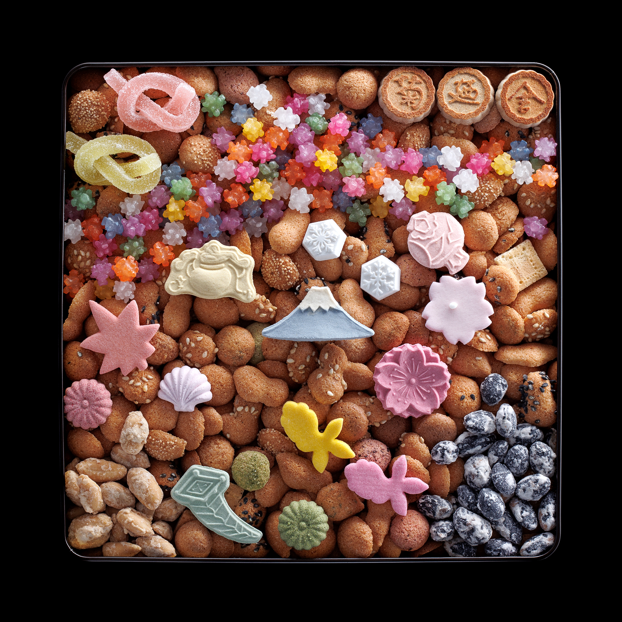 • 特 徴 :日本人が愛してやまない富士山と、日本の四季を江戸菓子で表現した風流な逸品。大切な方の幸せを祈る気持ちを虹に込めました。三盆糖で打った宝づくしや季節の打ち物、金平糖、黒豆、結び寒天の色彩、上品な落ち着いた色合いの缶との組み合わせも魅力的。彩りがより華やかになる中サイズ。