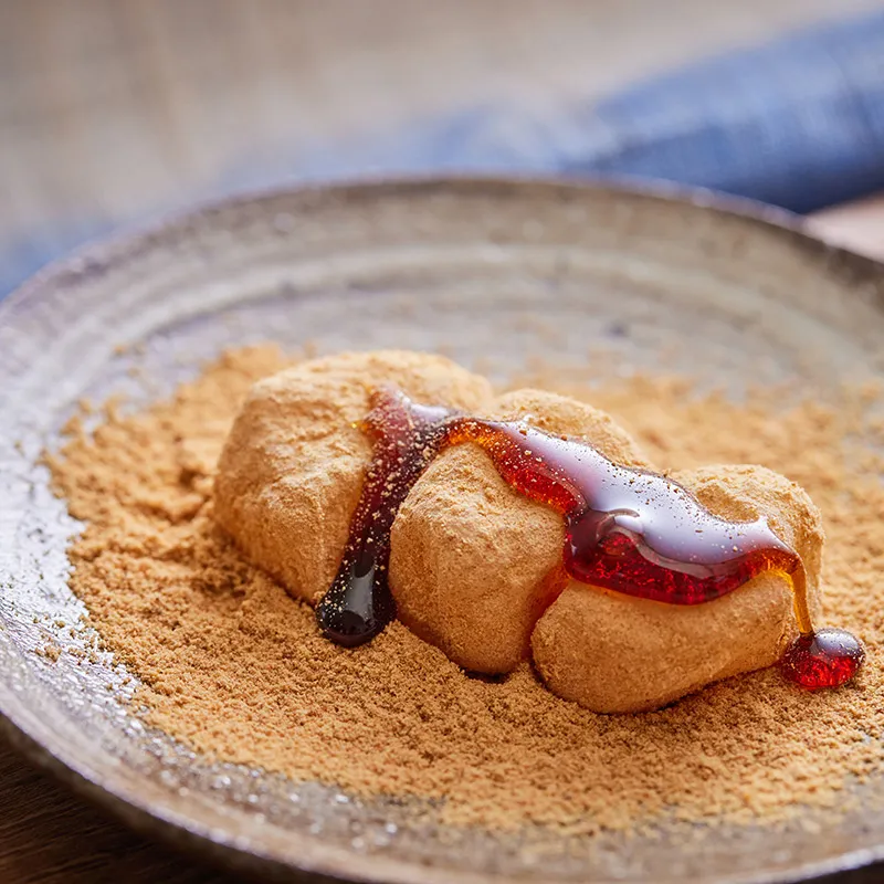 - 特 徴 :商品説明風呂敷包みを開けると、カップの中にきな粉をまぶしたお餅が3個入っています。黒糖のコクが活きる黒蜜をかけてお召し上がりください。安心できる県産のもち米と大豆を使用。
