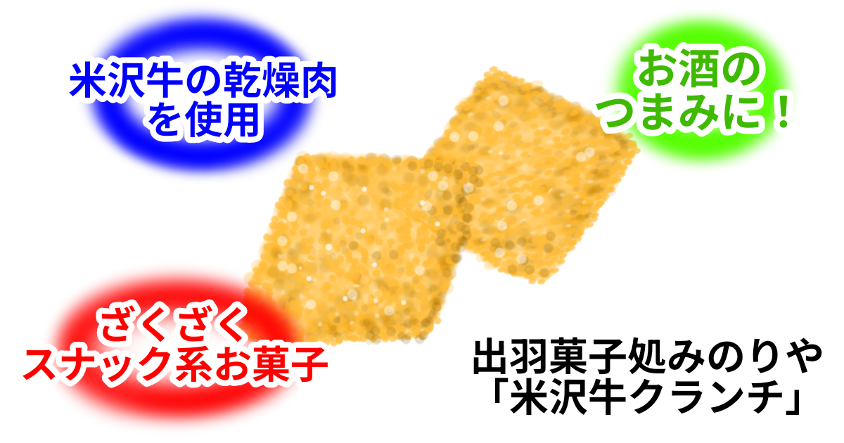 - 特徴:山形県のブランド牛「米沢牛」の乾燥肉を使用しており、米パフをクランチ状に焼き上げたサクサク感もクセになる焼き菓子です。香ばしいお肉の香りも楽しめます。